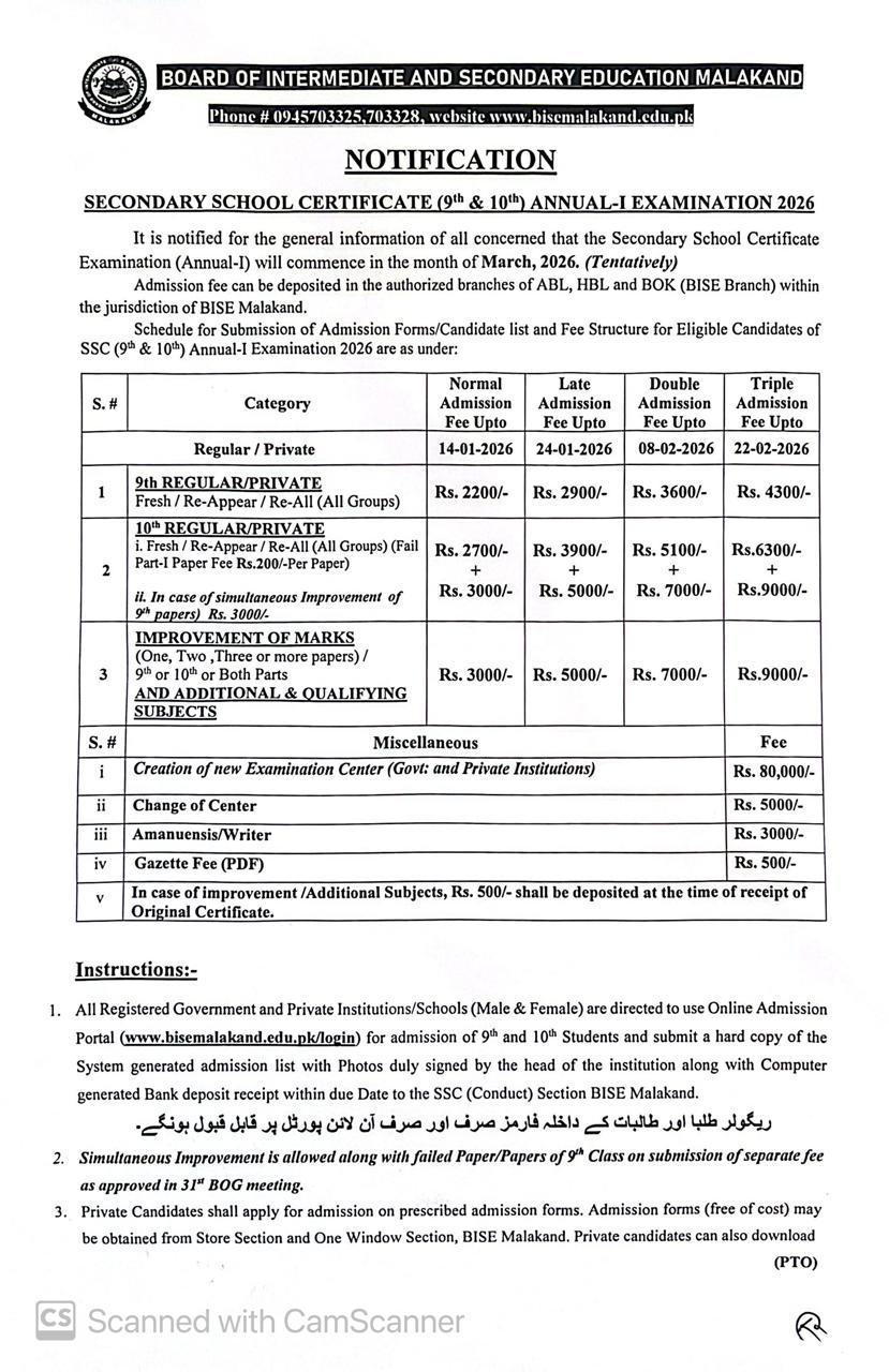 BISE Malakand receives the admission forms from the students for the coming BISE Malakand primary & middle classes annual exams 2026. The candidates submit the registration forms through their schools and they also receive their roll no slips and date sheet 2026 to appear in the Malakand Board 5th & 8th classes annual exams 2026.